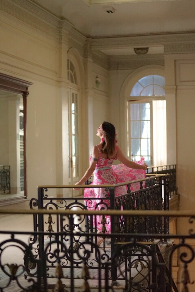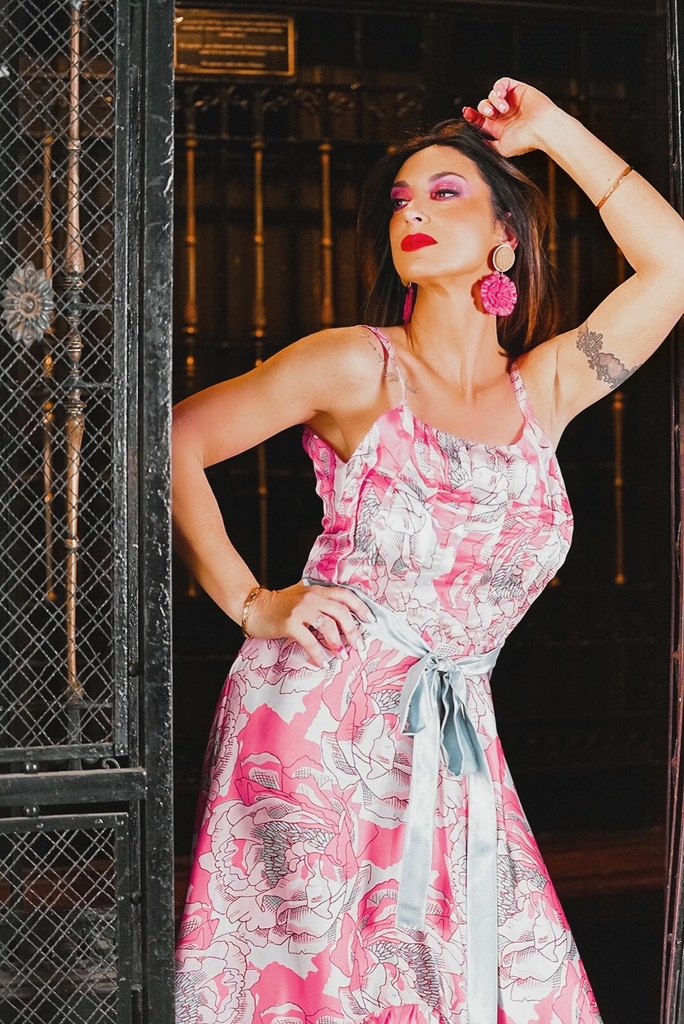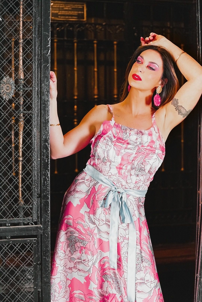 Maxi Vestido en seda estampada entallado con amplia falda media campana. Detalle en Pechera con alforzas y cinto celeste pastel