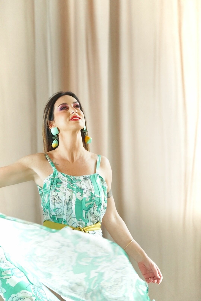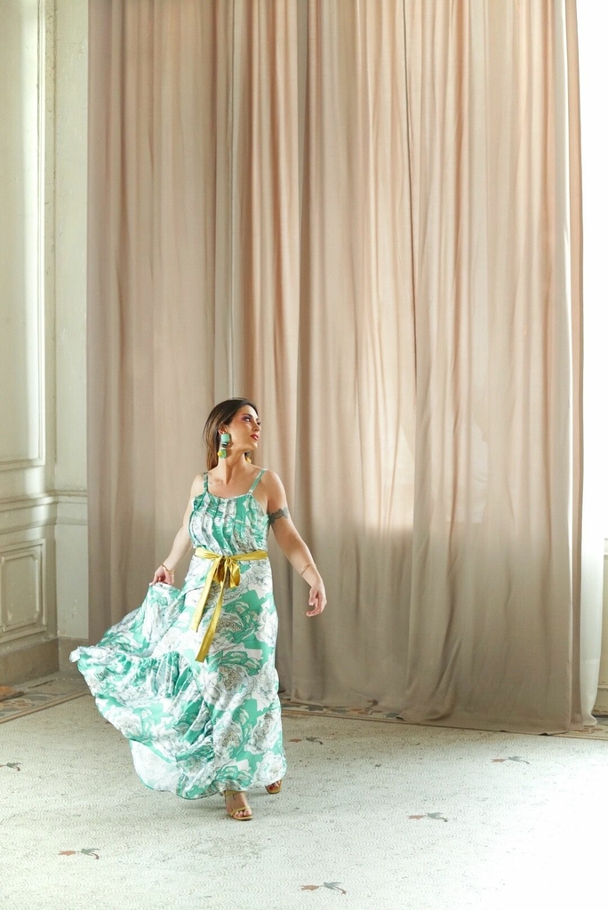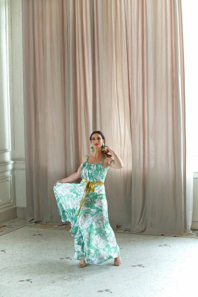 Maxi Vestido en seda estampada entallado con amplia falda media campana