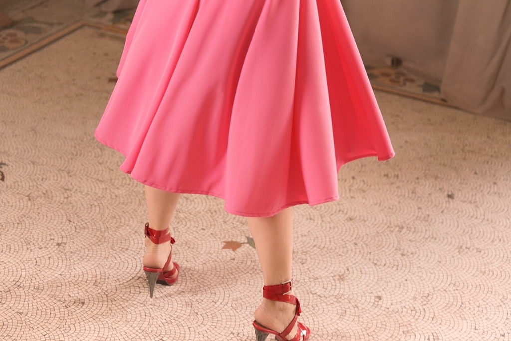 Diseño en Prada Rosa Chic de corte princesa, con escote en U. Falda en campana con tajo lateral izquierdo.